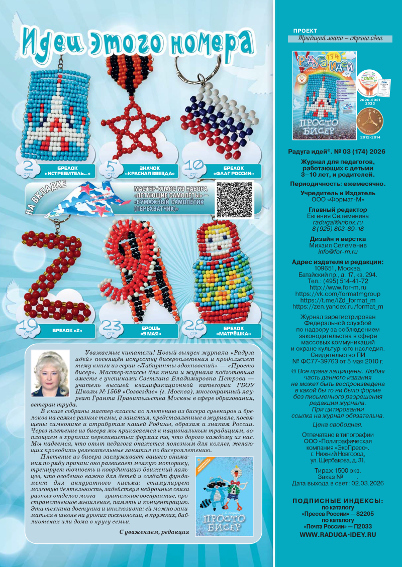 Уважаемые читатели! Новый выпуск журнала «Радуга идей» посвящён искусству бисероплетения и продолжает тему книги из серии «Лабиринты вдохновений» — «Просто бисер». Мастер‑классы для книги и журнала подготовила вместе с учениками Светлана Владимировна Петрова — учитель высшей квалификационной категории ГБОУ школы № 1569 «Созвездие» (г. Москва), многократный лауреат Гранта Правительства Москвы в сфере образования, ветеран труда.